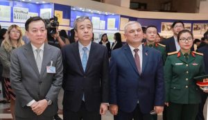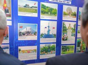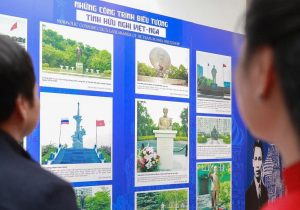 (Hình ảnh những công trình biểu tượng tình hữu nghị Việt – Nga được giới thiệu tại trưng bày chuyên đề “Dấu chân Hồ Chí Minh trên quê hương Cách mạng tháng Mười”. Ảnh: Phan Phương – TTXVN)