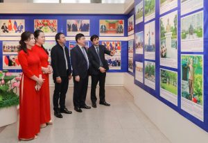 (Hình ảnh những công trình biểu tượng tình hữu nghị Việt – Nga được giới thiệu tại trưng bày chuyên đề “Dấu chân Hồ Chí Minh trên quê hương Cách mạng tháng Mười”. Ảnh: Phan Phương – TTXVN)